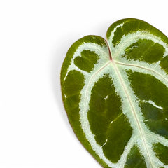 Anthurium crystallinum 'Silver' setzt stärker auf Kontrast als auf Masse und bildet schmalere Samtblätter mit besonders heller, sauber definierter silbriger Aderung, wodurch jedes Blatt fast gezeichnet wirkt. In Kultur erreicht die Pflanze meist etwa 50–70 cm und bringt damit Präsenz, ohne den riesigen Platzbedarf breiterer crystallinum-Formen zu haben.