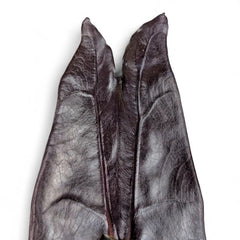 Alocasia longiloba ‘Purple’ pushes the species toward cleaner, darker contrast, with green blades lined in silver and rich violet undersides that show especially well when the leaves are raised. It stays more compact and upright than many elephant-ear types, usually around 60–80 cm indoors, so the effect is sharp and collector-oriented rather than bulky. The long-lobed outline remains the key feature, giving the plant a sleek architectural feel even when carrying only a handful of leaves.