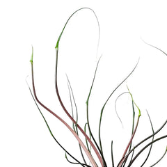 Alocasia macrorrhizos ‘Flying Squid’ is a mutation grown for its bizarre silhouette rather than conventional foliage, sending up long tentacle-like petioles topped by tiny flared tips instead of full broad blades. Because the leaves are so reduced, the whole plant feels animated and strange in a way no normal elephant ear does. It stays dwarf and compact compared with the species, which makes the odd form easier to appreciate at close range on a shelf or plant stand.