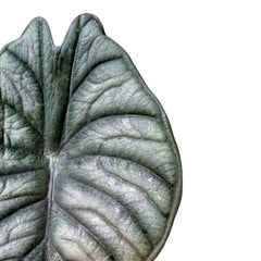 Alocasia nebula ‘Silver’ concentrates the species into a metallic jewel, with thick silver-grey leaves, dark recessed veins, and purple-backed depth that make the plant look almost mineral. It usually stays around 30–40 cm indoors, but the dense bullate texture gives it a premium, weighty feel beyond its size.