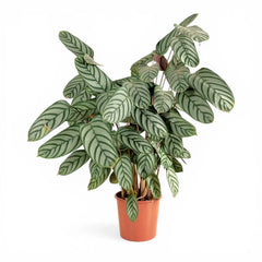 Ctenanthe setosa 'Compactstar' is a compact upright cultivar grown for silver-green leaves marked with dark herringbone striping and rich purple undersides that become more visible as the foliage shifts through the day. Usually reaching about 40–50 cm tall, it gives you the patterned impact of larger Marantaceae in a tidier, easier-to-place clump that works well on shelves, stands, and grouped displays.