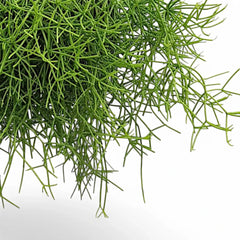 Rhipsalis teres f. heteroclada is a soft-stemmed rainforest cactus with cylindrical trailing growth and irregular branching that gives it a more tangled, natural look than straighter species. The stems arch and drape, sometimes blushing slightly under brighter light, and mature plants may add small white flowers and decorative berries. It stays non-toxic and spineless, which makes it easy to place in everyday living spaces.